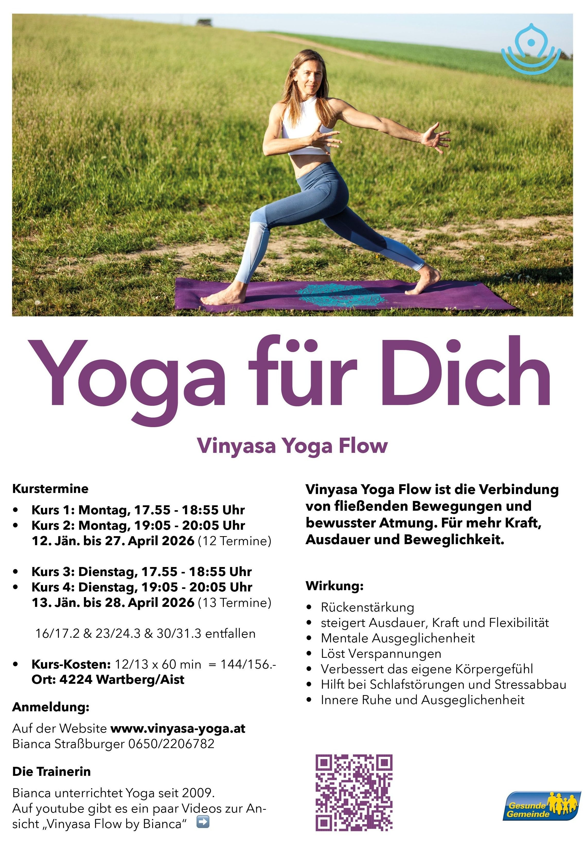 Yoga für Dich Vinyasa Yoga Flow | Kurstermine: von 12. Jänner bis 27. April 2026 (12 Termine) (kein Kurs am 16. Februar, 23. März, 30. März 2026) Kurs 1: Montag, 17:55 - 18:55 Uhr Kurs 2: Montag, 19:05 - 20:05 Uhr Kursort: Seminarraum im Dienstleistungszentrum, Hauptstraße 7 Kursbeitrag: € 144,00 Kursleiterin: Bianca Straßburger Anmeldung unter: 0650/2206 782 oder auf der Website www.vinyasa-yoga.at Vinyasa Yoga Flow ist die Verbindung von fließenden Bewegungen und bewusster Atmung. Für mehr Kraft, Ausdauer und Beweglichkeit Bianca unterrichtet Yoga seit 2009. Auf YouTube gibt es ein paar Videos zur Ansicht “Vinyasa Flow by Bianca” |