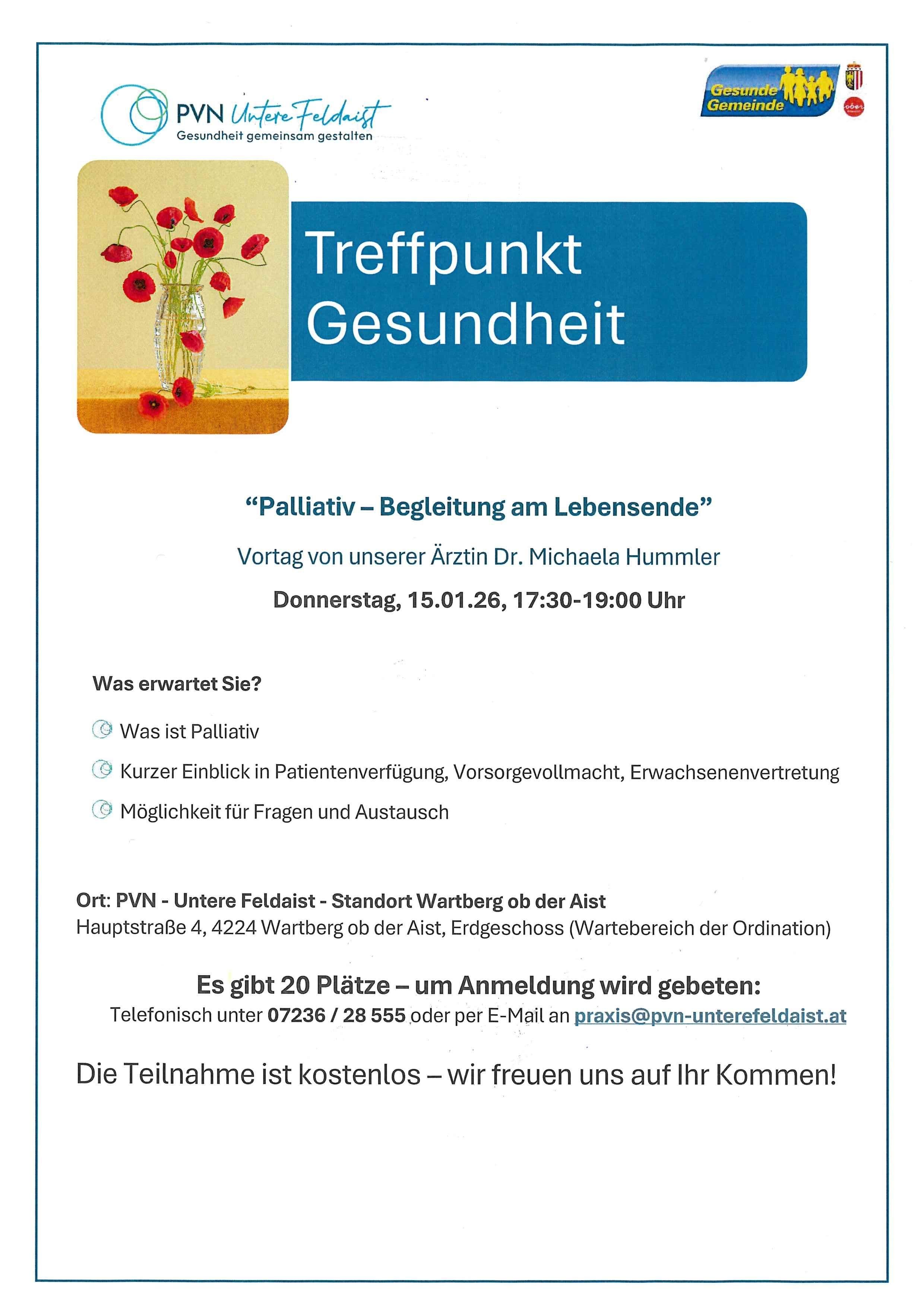 Treffpunkt Gesundheit Veranstaltungsreihe des PVN-Untere Feldaist und der Gesunden Gemeinde | “Treffpunkt Gesundheit” bietet kurze, praxisnahe Impulsworkshops zu unterschiedlichen Gesundheitsthemen. Kompakt, verständlich und mit vielen wertvollen Tipps für den Alltag. Termine und Themen 2026: 15.01. Medizin: Palliativ - Begleitung am Lebensende 26.02. Hebamme: Mythen und Fakten rund um die Schwangerschaft 25.03. Diätologie: Mythen, Fakten & Trends rund ums Essen und Trinken 23.04. Sozialarbeit: Wurzeln, die tragen: Resilienz als innere Kraftquelle 21.05. Physiotherapie: Trainingslehre und Bewegung im Alltag 18.06. Dipl. Gesundheits- und Krankenpflegerinnen: Wundbehandlung für zu Hause 24.09. Ergotherapie: Arthrose verstehen - Gelenke schützen im Alltag 22.10. Psychotherapie: Wenn´s im Kopf rundgeht - Wie Gedanken unsere Stimmung beeinflussen 19.11 Logopädie: Stimmstark durch die kalte Jahreszeit Ort: PVN-Untere Feldaist - Standort Wartberg ob der Aist, Hauptstraße 4 Zeit: jeweils von 17:30-19:00 Uhr Es gibt begrenzte Plätze - um Anmeldung wird gebeten: Telefonisch unter 07236/28 555 oder per E-Mail an praxis@pvn-unterefeldaist.at Jeder Vortrag ist einzeln besuchbar. Die Teilnahme ist kostenlos. Wir freuen uns auf Ihr Kommen! |