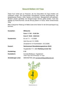 | Mittwoch, 07. Jänner 2026 bis 04. März 2026 (8x) Dieser Kurs richtet sich an Personen, die ihre Gesundheit mit Yoga erhalten und verbessern wollen. Die Kurseinheiten thematisieren einzelne Körperregionen, wie beispielsweise Rücken, Hüfte, Nacken und Schultern. Die Beweglichkeit wird gefördert, Muskeln werden gekräftigt und Verspannungen können gelöst werden. Auch das geistige zur Ruhe-Kommen und die Atmung stehen im Fokus. Keine Vorkenntnisse nötig. Bitte in bequemer Kleidung mit Matte sowie einer Decke für die Schlussentspannung kommen. |